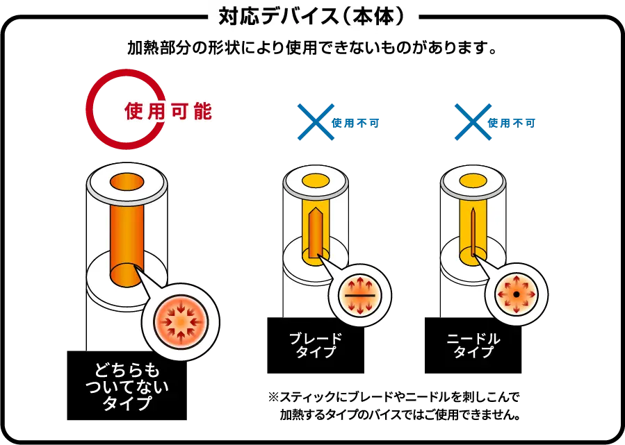 なお、ブレード加熱式(旧アイコスなど)、 外周加熱式(glo、Ploomなど)、その他(ベイプ系、リキッド交換式など)にはご使用いただけません。